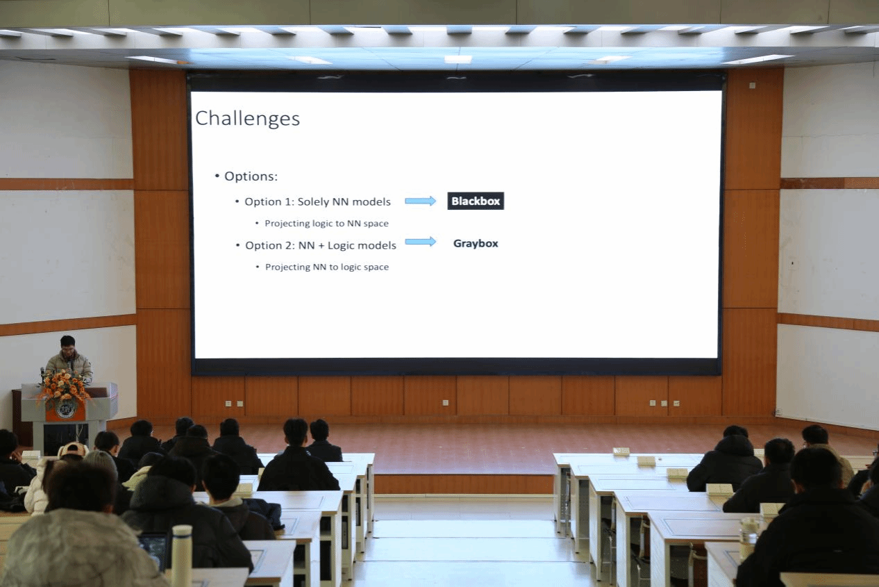 2026年1月6日上午,学院邀请南京大学人工智能学院卓汉逵教授作主题为“融合逻辑知识和观察数据的规划决策及应用”的学术报告,学院教师和研究生200余人参加报告会,会议由学院副院长左宪禹主持,报告在学院201教室举行