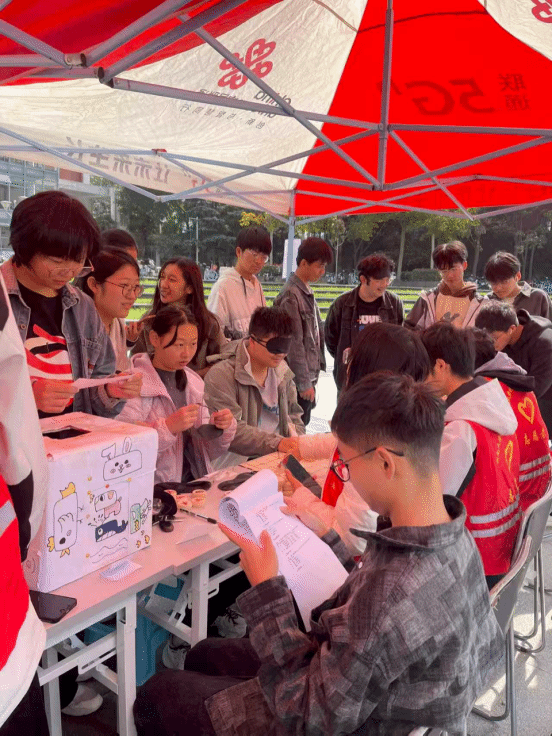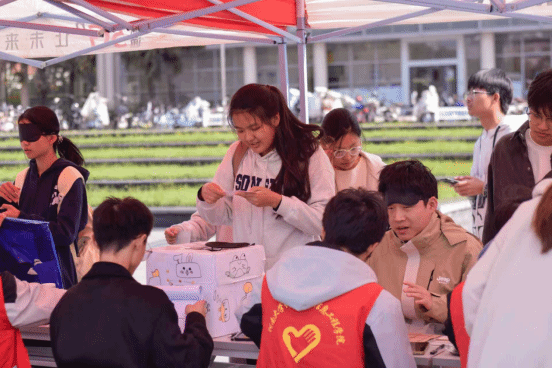 学院青年志愿者协会的志愿者团队在活动中设置了多个沉浸式体验环节,让参与者暂时“屏蔽”视觉,以盲人的视角触摸生活的肌理。活动现场,五个充满巧思的体验环节,让参与者沉浸式感受视障人士的生活场景。