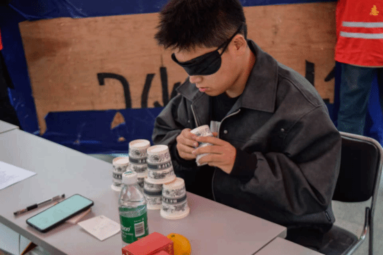 仅凭双手感知纸杯的形状与位置,将10个纸杯叠成竖直的“高塔”。过程中有人反复掉落、重新尝试,在一次次调整中,逐渐理解视障群体对空间感的精准把控,是日复一日的练习沉淀。